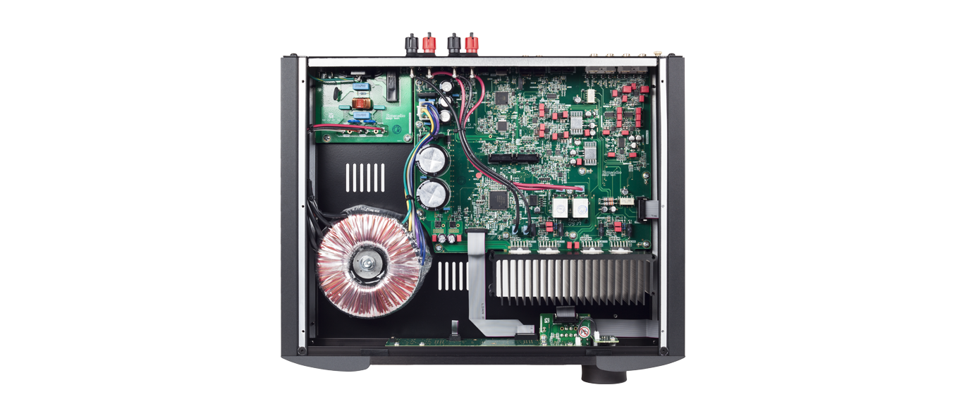Entradas análogas se pueden configurar para funcionar como modo “derivado”, que desvía la etapa de aumento para acomodar componentes como un procesador de teatro en casa, para usar su propio control de volumen.