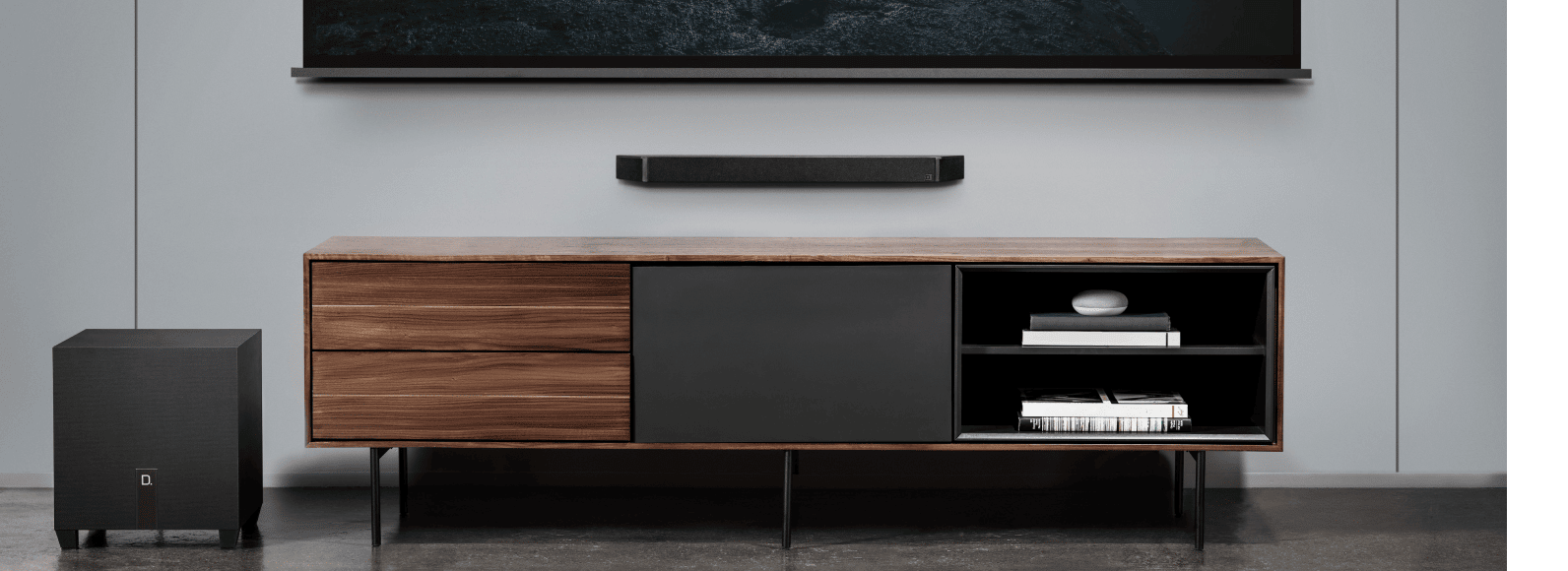 El subwoofer inalámbrico de 8” de largo alcance incluido puede mezclarse con la habitación, pero los graves potentes que ofrece seguramente atraerán la atención.