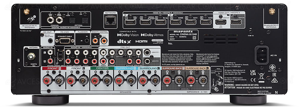 | Contenido del embalaje | Main unit, remote control, batteries, AM/FM antennas, wire labels, quick start guide, Audyssey microphone, card board microphone stand, 2 External Detachable Antenna, AC cord |