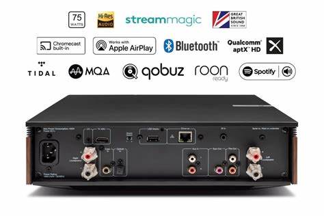 | Compatibilidad | TOSLINK óptico: 16/24 bits 32-96 kHz PCM solamente S/PDIF coaxial: 16/24 bits 32-192kHz PCM solamente, Bluetooth: 4.2 A2DP/AVRCP compatible con hasta aptX HD (24 bits 48 kHz) UPnP, medios USB locales, Airplay 2, Chromecast incorporado, radio por Internet, Spotify Connect, TIDAL, MQA, Qobuz, Roon Ready, ARC: 16/24 bits 32-192kHz PCM solamente, Deezer |